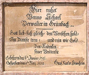 „Hier ruhet Benno Scharl, Verwalter in Grünbach, Gott lieb, sich gleich, den Menschen hold, im Dienste treu und rein wie Gold. Dem Andenken seiner Verdienste, Graf Karl von Seinsheim. Geboren 6. Juni 1741, gestorben 2. März 1812.“