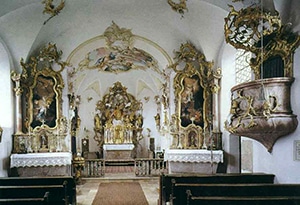 Betritt man das kleine Gotteshaus, tut sich ein Kirchenraum auf, der von der jubelnden Kraft des bayerischen Rokokos nahezu das Gewölbe sprengt. Der Hochaltar stellt ein frei geformtes, baldachinartiges Rocallegebilde dar. Die beiden, schräggestellten Seitenaltäre bestehen nur mehr aus einer asymmetrisch geschwungenen Rahmung mit Altarbild, einem leichten, vollkommen durchbrochenen, kräuselig sich rollenden Baldachinaufsatz und einer frei wie ein Bühnenrequisit an die Ecke gestellten Säule – elegant ist auch die Kanzel, mit einem vielfach durchbrochenen, sich auflösenden Schalldeckel. Es sind alles höchst qualitätsvolle, fast bizarre Gebilde des Rokokokünstlers Johann Anton Baader (1711-1786) aus Dorfen.