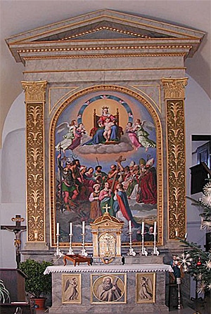 Im Inneren der Barockkirche erwartet den Besucher ein Kunstwerk von hohem Rang, ein spätklassizistisches Retabel des Dorfners Anton Fackler d.J., mit einem 1822 von Graf August von Seinsheim geschaffenem Hochaltargemälde „Maria in der Glorie mit den 14 Nothelfern“ im Stil der Nazarener.